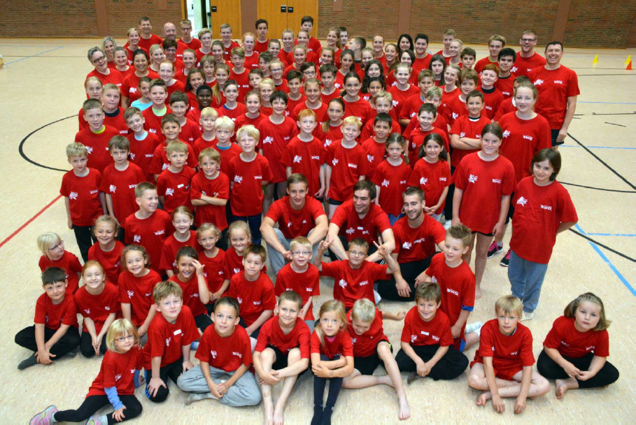 Leider startete der Samstag wieder einmal verregnet, so dass das Orga-Team sich entschied, den Vormittag in die Stadthalle zu verlegen. So zog die Karawane, die einen joggend, die anderen mit Autos, in Richtung Stadthalle. Um 10:00 Uhr starteten wir dort mit Morgengymnastik . Inzwischen hatten auch noch unsere jüngsten Sportler den Weg dorthin gefunden, so dass an diesem Tag 104 Kinder und Jugendliche am Camp teilnahmen. Anschließend gab es für alle das traditionelle rote Camp-T-Shirt. Danach teilten sich alle in altersgemischte Gruppen ein, um gemeinsam Workshops durchzuführen. Es musste z.B. eine Menschenpyramide gestellt werden, der Camptanz wurde geübt und Turnübungen für das Sportabzeichen konnten absolviert werden. Außerdem standen noch Tennisübungen, Hockey und ein Handball-Parcours auf dem Programm. Gegen 13:00 waren dann alle wieder auf dem Sportplatz, um sich mit Nudeln zu stärken. Ein großes DANKESCHÖN, geht an Antje Vogel vom Landgasthof Zum Schwanen, die das Mittagessen zubereitete und es spendete. Nach dem Mittagessen und einer kleinen Pause, ging es gegen 14:30 Uhr mit einem Kreativworkshop weiter. Bei diesem durften sich die Gruppen kreativ zum Thema Jubiläum 110 Jahre TV Mainzlar und 60 Jahre Burschenschaft Frohsinn austoben. Diese Plakate sollen am Jubiläumswochenende vom 10. -13 Juli 2015 im Festzelt präsentiert werden. Eine weitere Aktion war die Abnahme des Sportabzeichens (ein Dankeschön an Andreas und Markus). Am Volleyballnetz konnte jeder sein Können unter Beweis stellen. Aber auch Kopfsport stand auf dem Programm, hierfür musste ein Quiz mit rund 20 Fragen richtig beantwortet werden. Gegen 16:00 Uhr startetet dann unser sportlicher Eltern-Kind-Nachmittag mit Mama und/oder Papa, bei denen auch die Eltern bei Volleyball, Brennball und Fußball ihr sportliches Können unter Beweis stellen konnten. Nach soll viel Sport musste sich