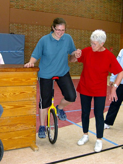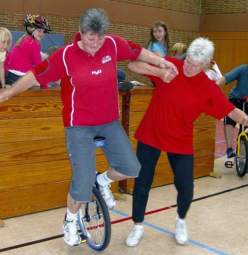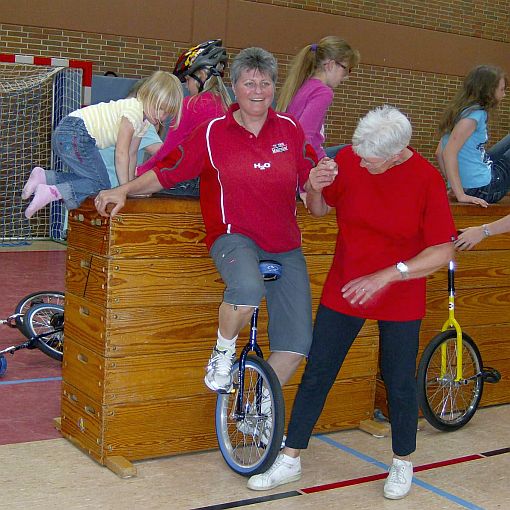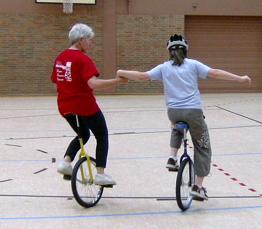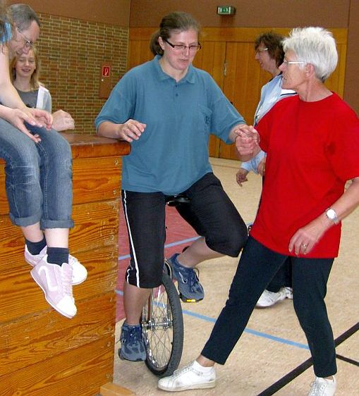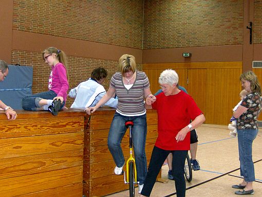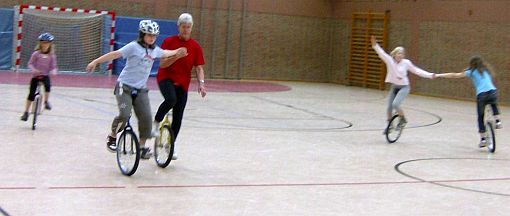 Zu diesem Treffen hatte der TV 1905 Mainzlar Heidrun Neidel aus Leihgestern als Übungsleiterin eingeladen. Sie zeigte den Kindern, die bisher noch nicht Einrad fahren konnten, wie sie es lernen können. Wichtig hierbei ist auch die Mithilfe der Eltern, die mit den richtigen Handgriffen den Kindern die Angst nehmen können. Den Kindern die mit dem Einrad schon ohne Hilfestellung fahren konnten, gab Frau Neidel einige Tips und weitere Anregungen zum Einradfahren. Auch die anwesenden Erwachsenen konnten das Fahren auf einem Rad ausprobieren. Dies wurde auch mit mehr oder weniger großem Erfolg gerne angenommen. Nach 1,5 Stunden intensivem Üben waren alle anwesenden Kinder in der Lage (zum Teil mit Hilfestellung) mit dem Einrad ihre Runden durch die Halle zu drehen. Alle Kinder, die an dieser Trainingseinheit teilgenommen haben, hatten viel Spaß und würden das sicher gerne wiederholen.