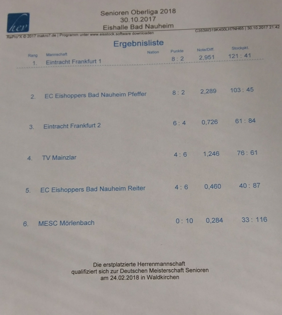 Am 29.10.2017 spielten unsere Eisstock Senioren in der Oberliga im Eisstadtion Bad Nauheim um den Aufstieg in die Bundesliga West. Leider reichte es nicht für den Aufstieg in die Bundesliga West. Erreicht wurde der 4. Platz mit 4:6 Punkten und einer Stockquote von 1,246.