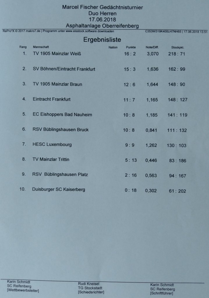 Am Samstag fand in Oberreifenberg ein Trio Turnier mit 9 Herren Mannschaften statt, an dem der TV 1905 Mainzlar e.V. mit 2 Mannschaften teilgenommen hat. Erzielt wurden hier die Plätze 4 und 5. Am Sonntag spielte der TV 1905 Mainzlar e.V. dann mit 3 Duo Mannschaften wiederum in Oberreifenberg. Hier konnte sich der TVM nicht nur den 1. Platz, sondern auch den 3. und 8. Platz im Herren Duo von insgesamt 10 Mannschaften sichern.