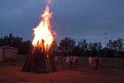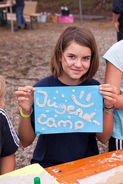 Die Kinder und Jugendlichen ließen sich durch das Wetter nicht die Lust und Motivation auf das Jugendcamp nehmen. Die Zelte konnten am Freitagnachmittag bei noch bedecktem Himmel aufgebaut werden. Die offizielle Eröffnung fand im Sportlerheim statt. Jugendwart Gerhard Schwalb begrüßte die Kinder und Jugendlichen und gab das Wort an Pfarrer Traugott Stein weiter, der alle Teilnehmer auf die nächsten Tage einstimmte. Der Regen ließ nach und es konnte gegrillt und somit der traditionelle Campburger genossen werden. Nach dem Abendessen wurden die Kinder und Jugendlichen aktiv, spielten Fußball, richteten die Zelte ein, oder erkundeten das Sportgelände. Gegen 20.30 Uhr wurden die vorbereiteten Holzstapel entzündet. Kurz darauf ertönten Gitarrenklänge von unseren Gästen Inga und Mischa Jung. Schnell füllten sich die Plätze um das Lagerfeuer, um den beiden zuzuhören oder mitzusingen. Von „Über den Wolken“, bis „Country Roads“, waren viele bekannte Titel zu hören. Die Stimmung war einfach nur klasse.