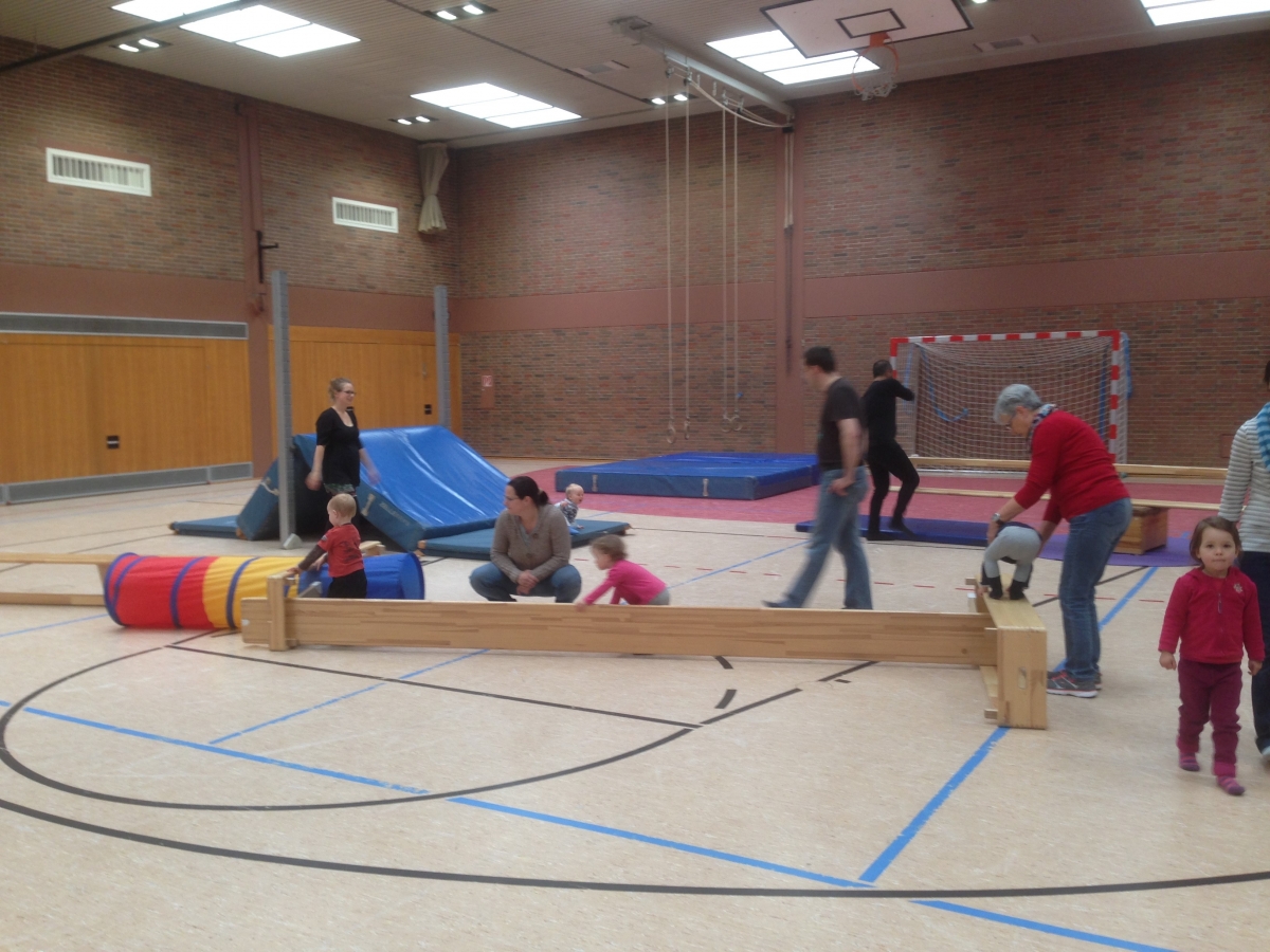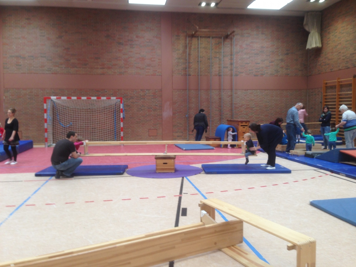 Regelmäßig treffen sich die Kinder und Mütter (manchmal auch der Papa oder die Oma) Mittwochs von 9 bis 10 Uhr in der Stadthalle Staufenberg zur Turnstunde.