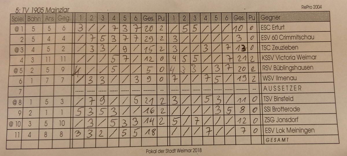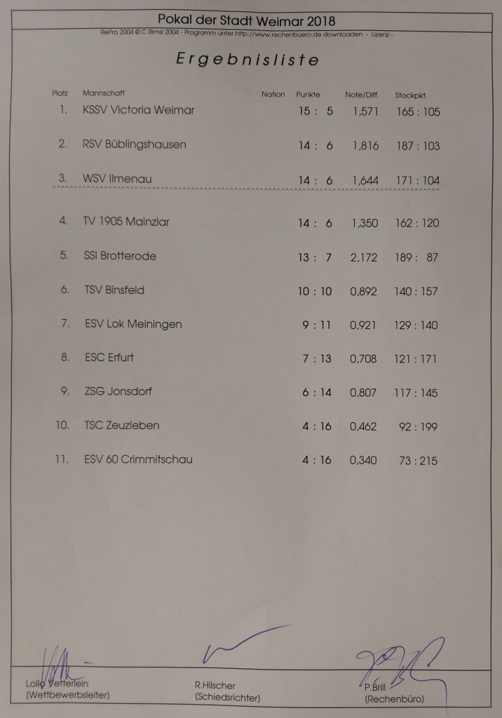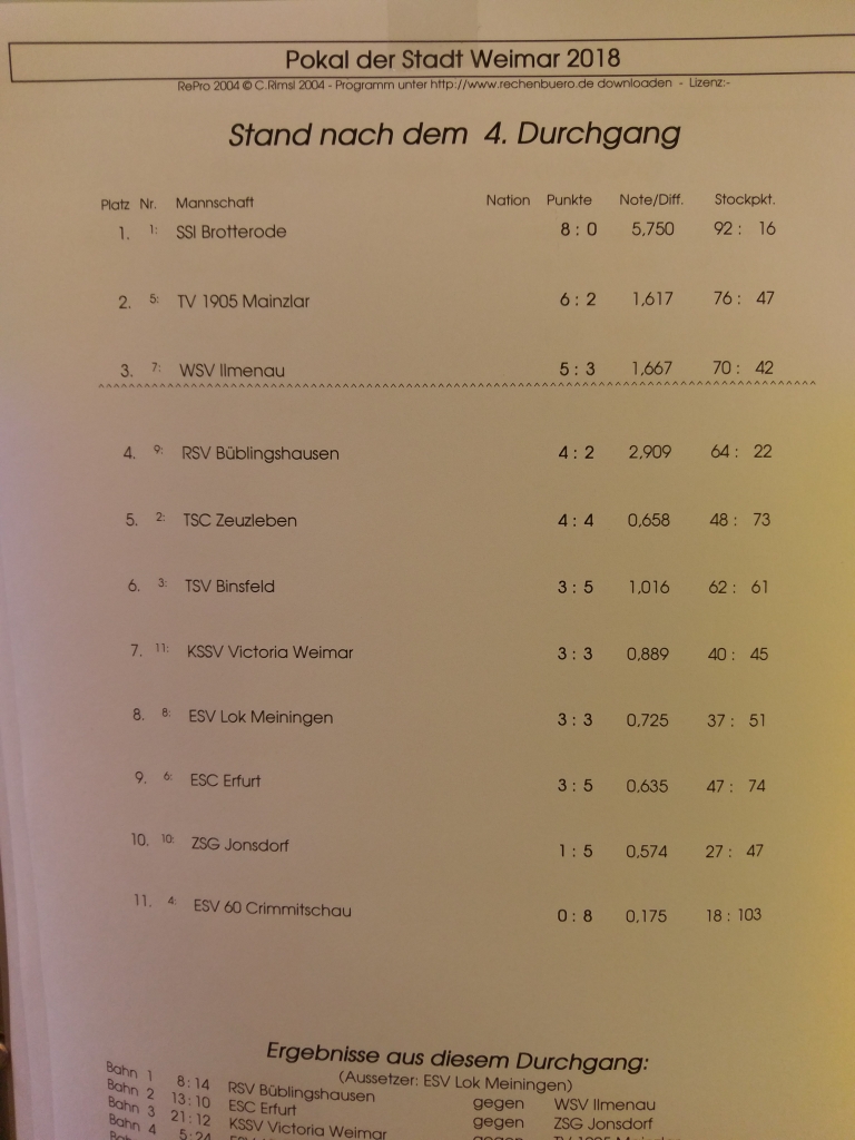 Der Blick auf die Endtabelle zeigt, nur 1 Punkt mehr und der 2. Platz wäre für den TVM gewesen und mit 2 Punkten sogar der 1. Platz. So reichte es leider nur für den 4. Platz im Pokal der Stadt Weimar.