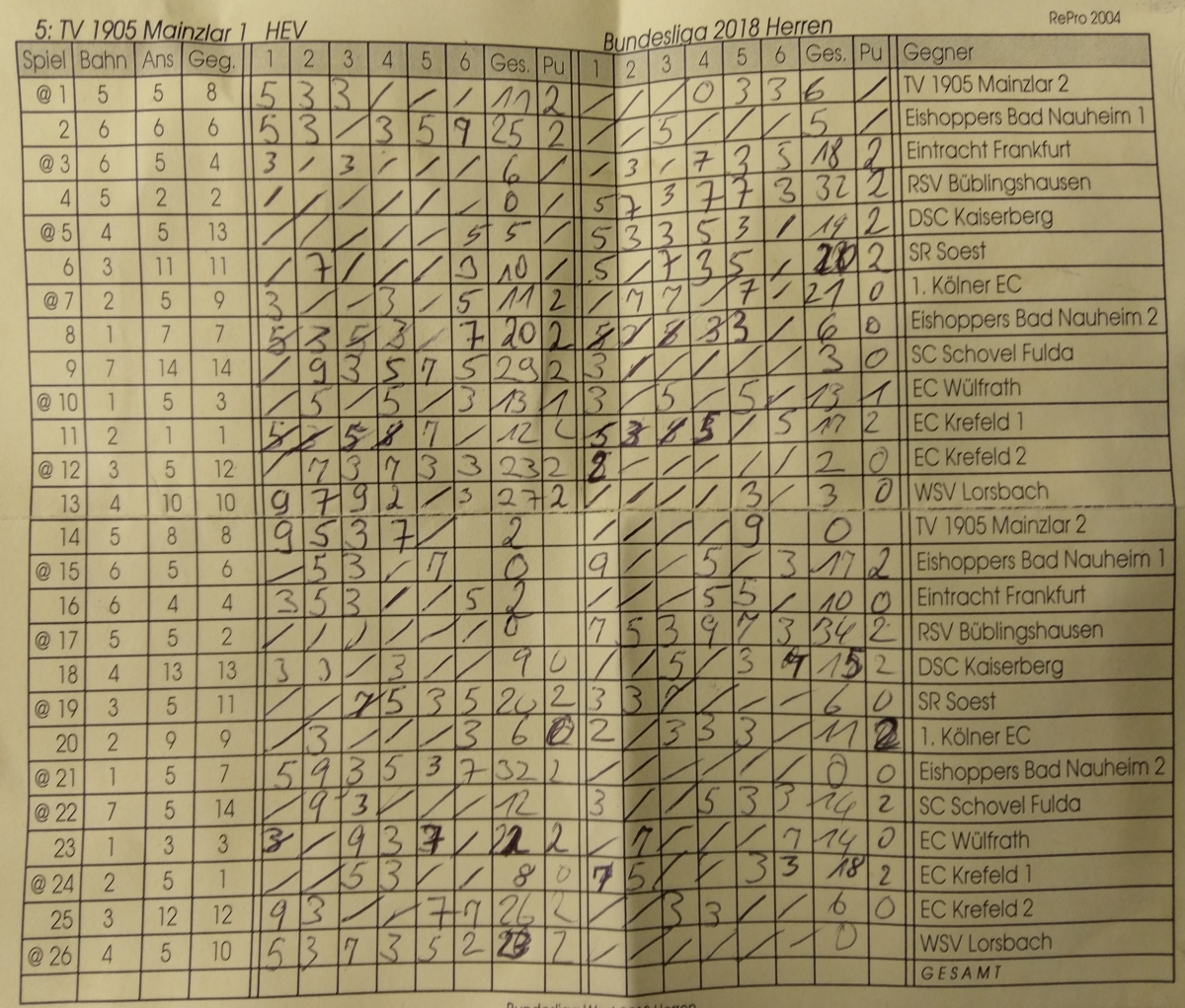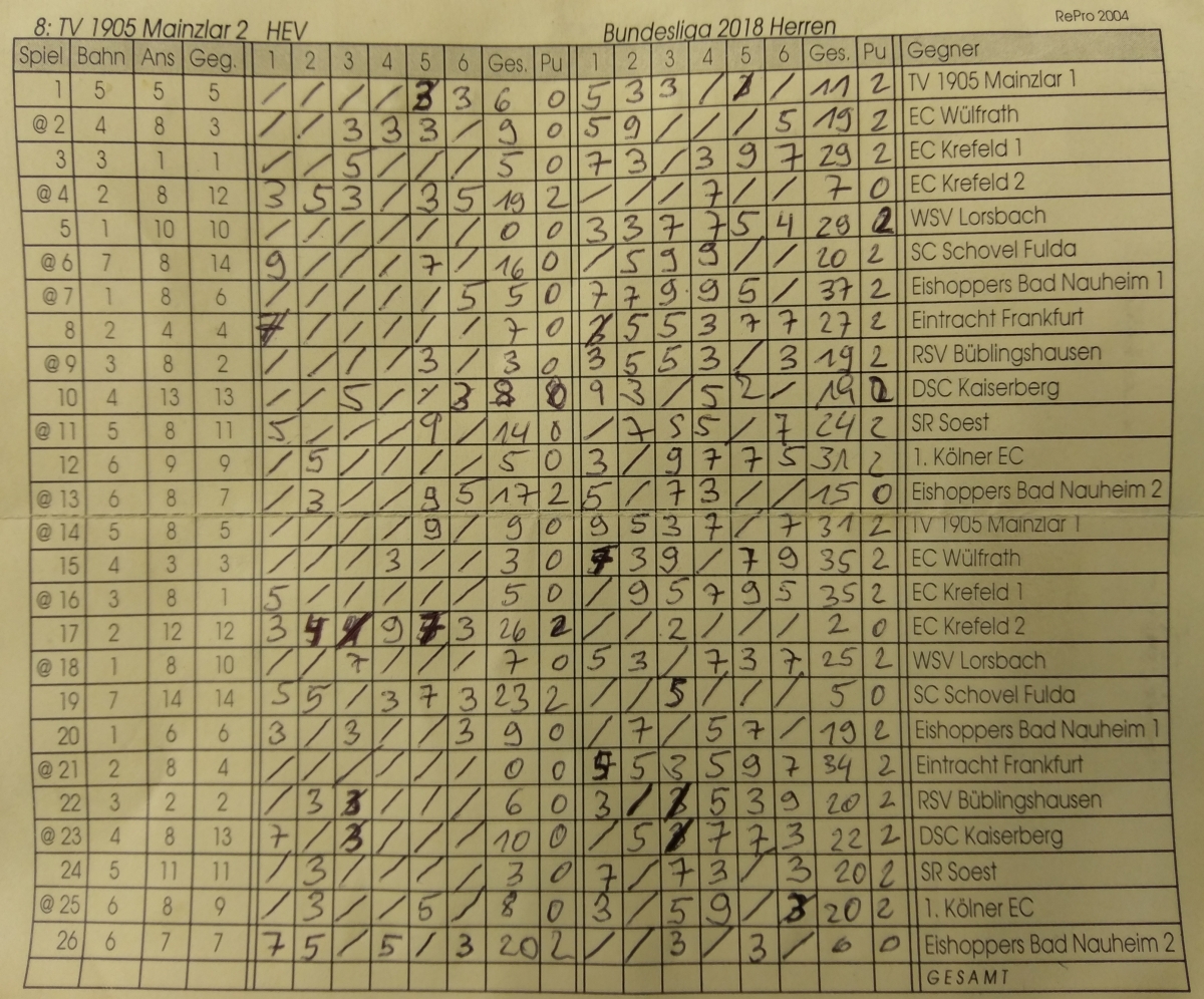 Nach dem 19. Durchgang (Spiel) konnte der TV Mainzlar 1 den 8. Tabellenplatz mit 21:17 Punkten (1,186 Stockquote) halten und der TV Mainzlar 2 sogar auf den 11. Tabellenplatz mit 8:30 Punkten (0,445 Stockquote) aufrücken. Nach dem alle 26 Spiele für unsere beiden Mannschaften durch waren, hieß es nur noch warten auf den endgültigen Tabellenstand. Auch in diesem Jahr war es so das die letzten beiden Mannschaften aus der Region Hessen und NRW nicht weiter in der Bundesliga spielen und somit in die Oberliga absteigen. Um kurz nach 12 Uhr stand es dann fest, der TV Mainzlar 1 konnte sich mit 29:23 Punkten und einer Stockquote von 1,361 einen der mittleren Plätze (8. Tabellenplatz) in der Bundesliga sichern. Beim TV Mainzlar 2 war es dagegen eine wackelige Sache. Sie belegten mit 10:42 Punkten und einer Stockquote von 0,433 leider nur den 12. Tabellenplatz und setzten sich somit vor den SC Schovel Fulda (8:44 Punkte) und EC Krefeld 2 (4:48 Punkte). Da vor der Bundesliga noch der Mörlenbacher Eisstock Club abgesagt hatte, mussten unsere Eisstockschützen auch nur eine Hessische Mannschaft hinter sich lassen, welche der SC Schovel Fulda war. Somit spielt auch in der nächsten Saison der TV 1905 Mainzlar e.V. mit 2 Mannschaften in der Bundesliga West.
