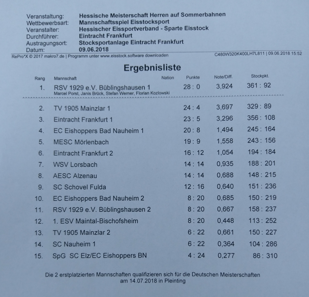 Am 09.06.2018 fand in Frankfurt am Main die Hessische Meisterschaft im Eisstock auf Sommerbahnen statt. Auch der TV war dieses Jahr wieder mit 2 Mannschaften an dieser Meisterschaft vertreten. Beide Mannschaften gaben bei besten Wetter und Temperaturen um die 30 Grad ihr bestes. Am Ende des Turniers reichte es zwar nur für den 13. Platz beim TVM 2 doch der TVM 1 konnte sich nach dem RSV Büblingshausen den 2. Platz mit einer super Stockquote von 3,697 sichern. Leider reichte der 2. Platz nicht für einen Startplatz bei der Deutschen Meisterschaft im Juli in Pleinting, doch einen Platz beim letzten Deutschen Pokal auf Eis in Regen ist dem TV aber sicher.