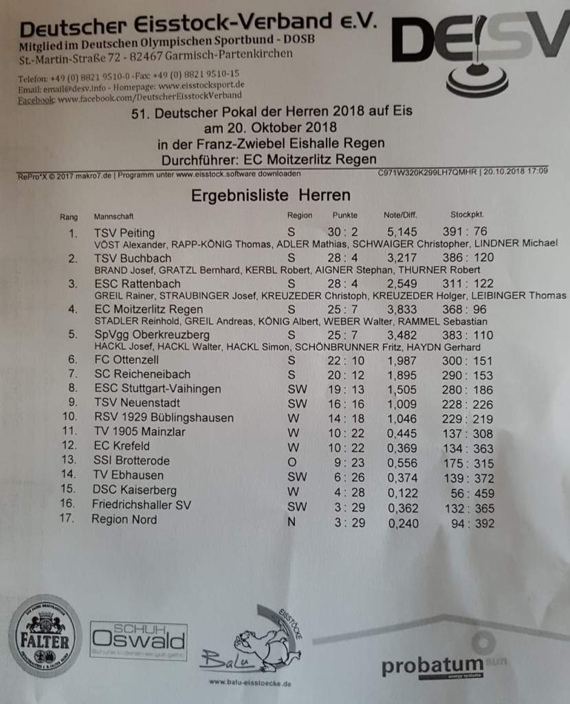 Am 20.10.2018 wurde zum 51. Mal der Deutsche Pokal auf Eis ausgespielt. In diesem Jahr fand die Veranstaltung in Regen (Bayern) statt.