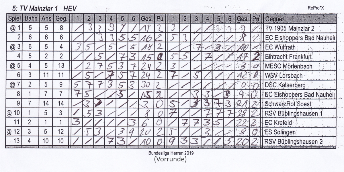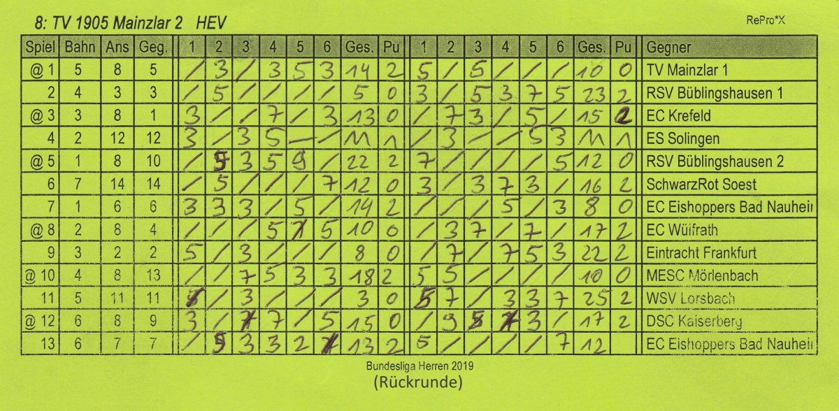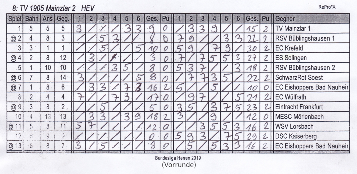 In einem starken Teilnehmerfeld entwickelten sich spannende Spiele. Unsere beiden Mannschaften bestritten, wie immer bei 2 teilnehmenden Mannschaften eines Vereins, das erste Spiel, das mit 15:9 von der ersten Mannschaft gewonnen wurde. Nach 2 weiteren Siegen unserer „ersten“ gegen Bad Nauheim und Wülfrath musste man sich der Mannschaft von Eintracht Frankfurt mit 15:17 denkbar knapp geschlagen geben. Anschließend folgten vier weitere deutliche Siege gegen Mörlenbach, Lorsbach, Kaiserberg und Bad Nauheim ehe das Spiel gegen Soest deutlich mit 3:21 verloren wurde. Danach war der Faden gerissen und man musste 2 weitere Niederlagen einstecken. Am Ende der Vorrunde belegte die erste Mannschaft mit 16:10 Punkten trotzdem einen hervorragenden 4. Platz. In der Rückrunde konnte man das Ergebnis des Vortages sogar noch steigern und holte 18:8 Punkte. Am Ende des zweitägigen Turnier bedeuteten 34:18 Punkte und eine Stockquote von 1,355, Platz 4. Damit wurde zwar die direkte Qualifikation zur Deutschen Meisterschaft um 2 Punkte verpasst, ist aber 1. Nachrücker für den Fall das eine andere qualifizierte Mannschaft nicht teilnimmt.