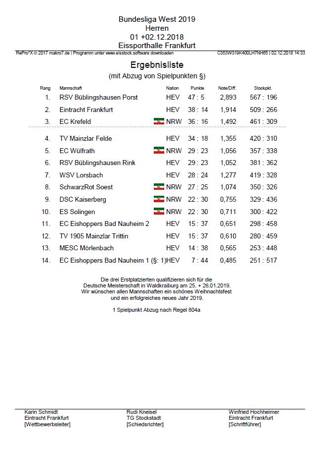 Am 01. und 02. Dezember 2018 fand das Turnier der Bundesliga West im Eisstockschießen mit Vereinen aus Hessen und Nordrhein-Westfahlen in der Eissporthalle in Frankfurt statt.