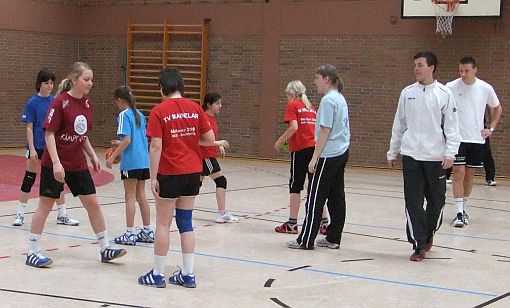 Auf dem Programm stand diesmal die 1:5-Abwehr unserer weiblichen D-Jugend, die sich als Demo-Team gleich zur Verfügung stellte.